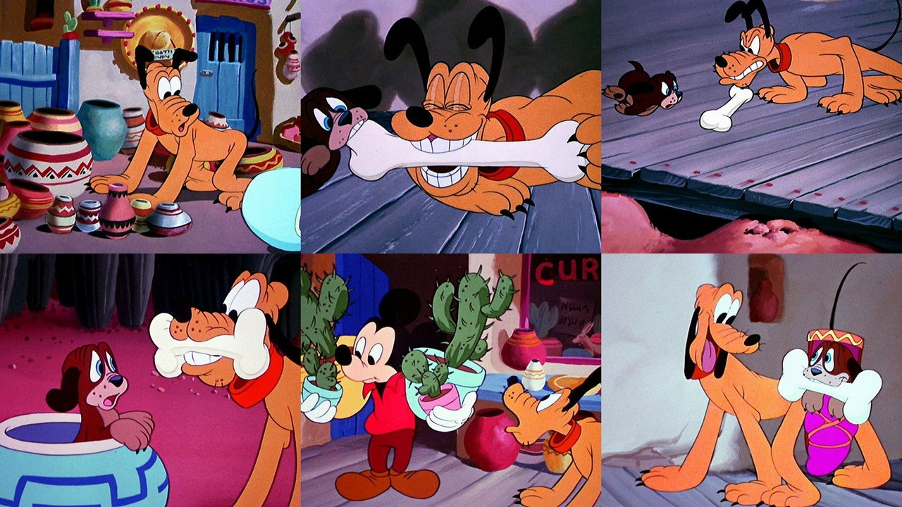 Mickey goes into a souvenir shop out west and leaves Pluto with a buffalo bone to chew on. A small dog comes to take it away and runs into a ring of cactus with it; Pluto is too big to enter the same way, so he comes in from above and finds himself stuck inside until the small dog helps.