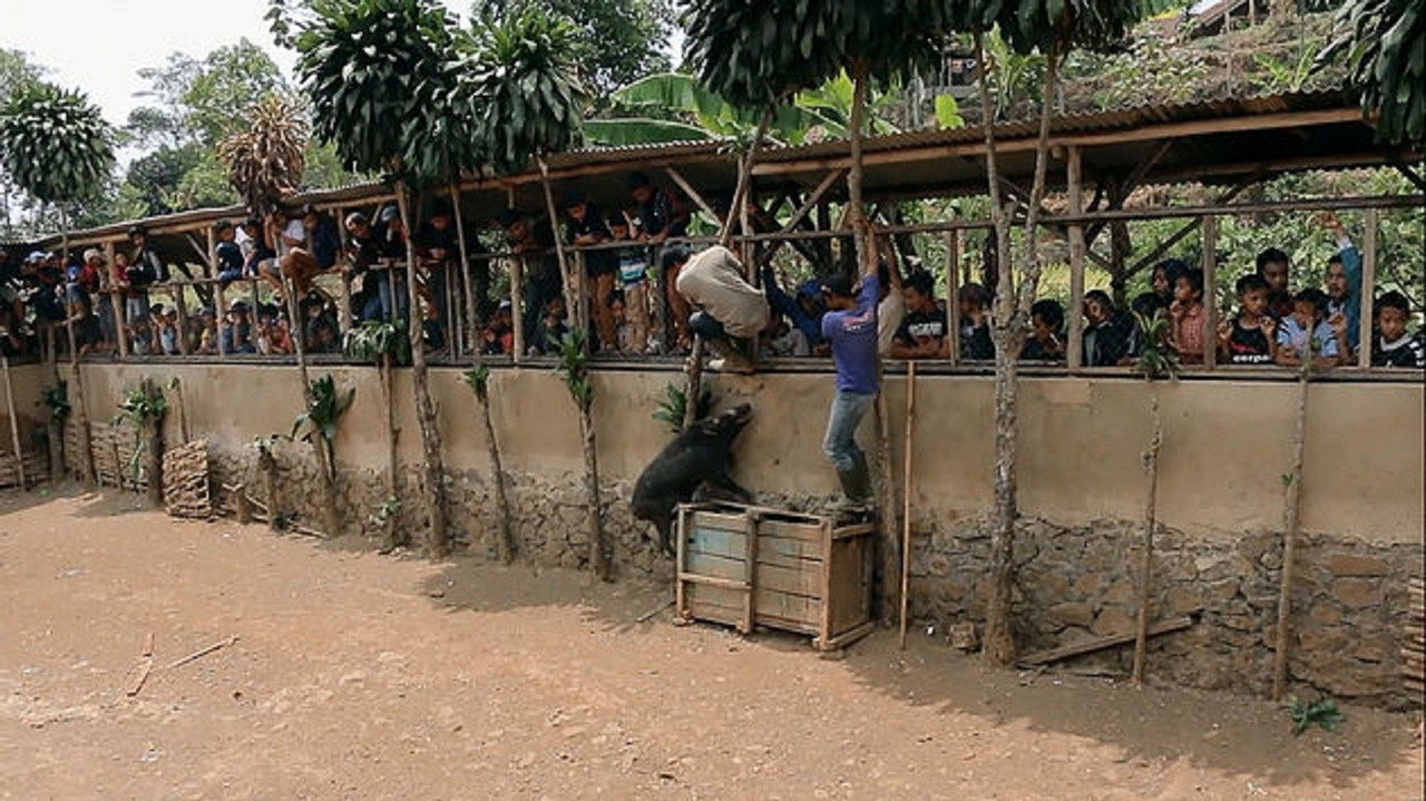 A family in rural area of West Java, Indonesia enjoys their time with 'Ngadu Bagong', a sundanese traditional game where dogs put to fight against a wild boar in a single event. Ngadu Bagong has always been some sort of animal abuse but it's been in the tradition for a long time. Ade Rohmat has been in the game for a long time; a hobby that he now passes on to his daughter, Ilma Nurjanah. The potentially controversial Ngadu Bagong has always brought intense emotion, prestige, and fortune upon its practicioners.