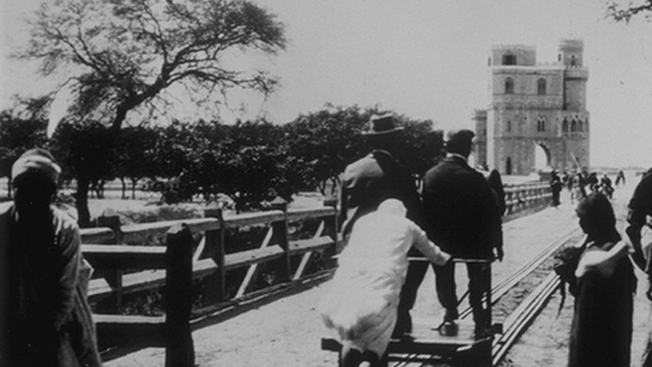 Travellers, nomads and salesmen make their way along a dam next to the Nile.