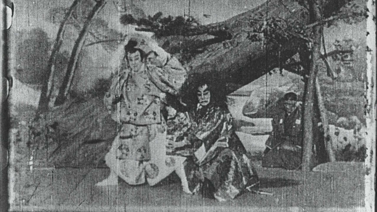 A reel of the Noh drama Momiji-gari, in which Danjuro Ichikawa played opposite Onoe Kikugoro V as an ogress who has disguised herself as the Princess Sarashina. Filmed by Shibata Tsunekichi in the open air on a windy day in November 1899, Danjuro would allow only the one take, so that when his fan blew away in mid-performance the scene had to stay. The film re-emerged at the Kikikan theatre in 1907 where it was a great success and inspired a wave of fiction filmmaking based on traditional Japanese narratives.